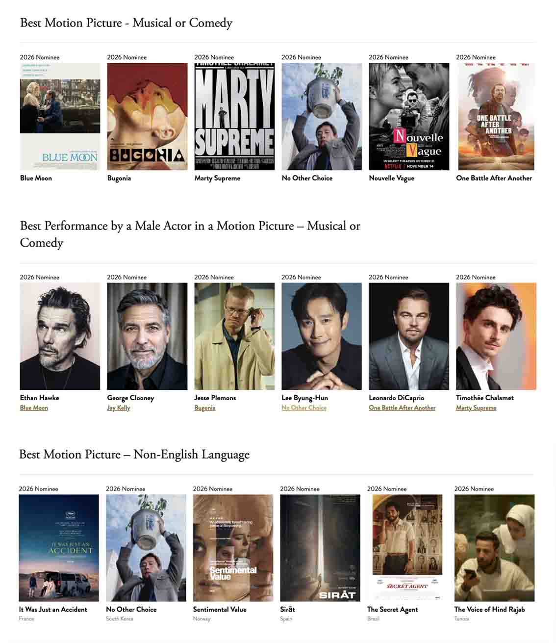 골든글로브 공식 홈페이지에 공개된 후보 명단에 따르면, ‘어쩔 수가 없다’는 뮤지컬·코미디 영화 부문 최우수 작품상 후보로 이름을 올리며 ‘블루 문’, ‘부고니아’, ‘마티 슈프림’, ‘원 배틀 애프터 어나더’ 등과 수상을 두고 맞붙게 됐다. 작품의 독창적인 연출과 배우들의 호연이 인정받았다는 평가다.